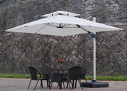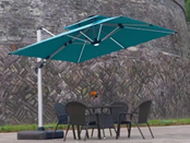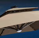 Parasol mecanizado operado por control remoto, su panel solar de energía fotovoltaica alimenta el sistema de apertura y cierre, el parlante bt, y su sistema de iluminación en las varas y lampara central.